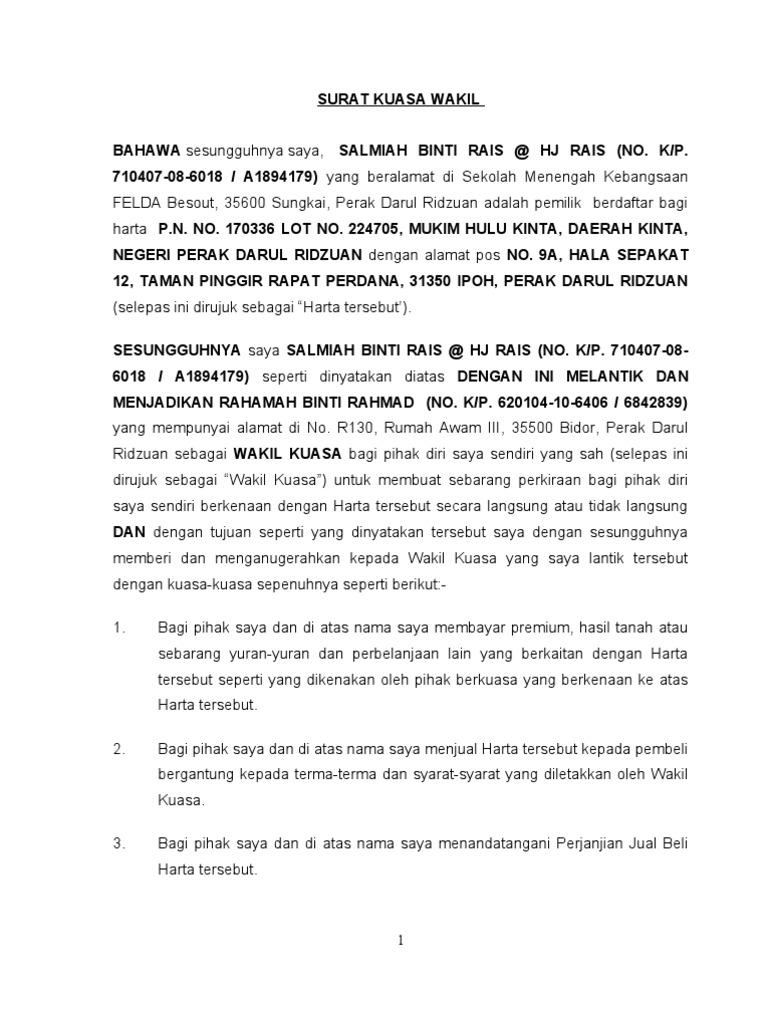 Contoh surat wakil untuk ambik geran atau sebagainya.